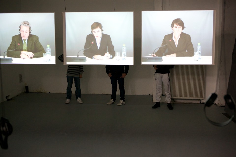 Dans cette installation vidéo, des interprètes, qui oeuvrent habituellement dans l’ombre de diplomates et de politiciens restituent la conversation entre un soldat américain qui revient d’Irak, une propriétaire d’hôtel et une vendeuse de voitures. A l'image du traducteur, le spectateur n'entendra que des réponses isolées et prend acte d'un réel en lien avec la guerre, mais fragmenté, loin des évocations spectaculaires qu'en font les journaux. Il est ici question de la langue en tant qu’outil, des enjeux et des conséquences de son maniement, notamment dans le champ politique.