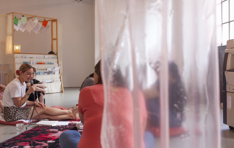 livres en libre consultation, photocopieuse, boîte à livres, infokiosque par Stéphanie Rosianu, bar et petite restauration, tapis par tapis.vnr, pièce sonore de Juliette Henrioud, échanges autour des lectures de pde