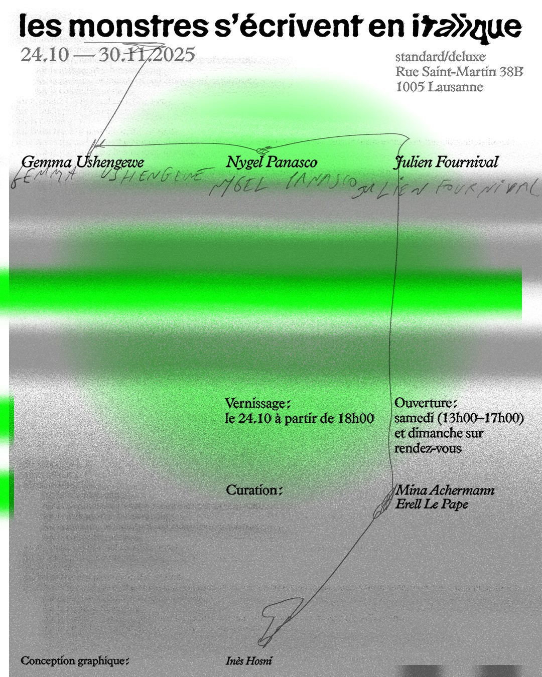 Du 24 octobre au 30 novembre 2025, l’exposition les monstres s'écrivent en italique ouvre au coucher du soleil, quand il fait assez sombre pour que les lumières choisies, et non subies, puissent prendre l’espace. It is the time of the hunt, and the air vibrates with an invisible tension. Il est temps de fuir, d’échapper à la lumière blanche qui impose une fiction aveuglante. La lumière verte découpe des silhouettes, projetant des contre-histoires là où l’hégémonie croyait tout verrouiller. A voice rises from the darkness, seeming to search for a place of refuge. This night, it announces, they are all here.